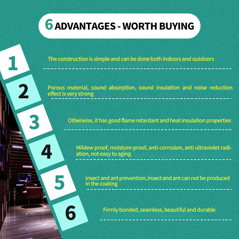 Construction method: spraying. At least 3 mm thick. Manual spraying: (use ordinary real stone paint spray gun. The construction method is spraying like real stone paint). General construction area: A worker can do 150 to 200 square meters per day, depending on the thickness. If the thickness is 0.5 cm and the coating dosage is 1 square meter /5 kg, it can be sprayed for molding at one time; If the thickness is 1 cm and the coating dosage is 1 square meter /10 kg, it can be sprayed twice for molding If the thickness is 1.5 cm and the coating dosage is 1 square meter /1.5 kg, it can be sprayed for molding three times; Coating area: 1m2/1kg/0.1cm; Different thicknesses require different quantities Drying time: the surface drying time is more than 300 minutes /30 degrees Celsius, and the dry time is more than 72 hours /30 degrees Celsius. 1.Construction temperature: ≥5 degrees Celsius Storage: Store in a cool, ventilated and dry place at 5-25℃. Guard against frost. At the same time, it meets the national thermal insulation standard GB/T 10294-2008 (Determination of steady-state thermal resistance and related characteristics of thermal insulation materials), and the thermal conductivity is 0.063wd(m.k) 2: Plane sound-absorbing paint (sound-absorbing latex paint)