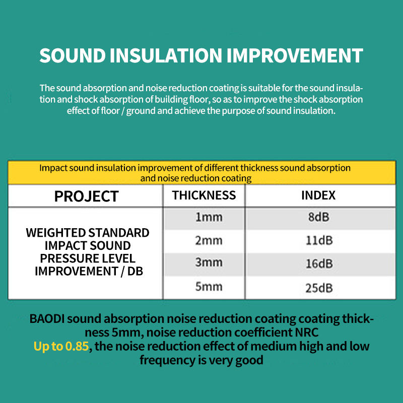 Construction temperature; ≥5 degrees Celsius. Construction technology: scraping putty paste twice-primer-1-2 times-sound-absorbing paint topcoat twice. Storage: Store in a cool, ventilated and dry place at 5-25℃. Guard against frost. 3: sound-absorbing coatings Type: Sound-absorbing materials and acrylic copolymer compounds, selected high-quality additives and pigments and fillers at home and abroad. Construction ratio: generally do not dilute, if you need to dilute, please add clear water to dilute, not more than 10% of the total weight of the paint (paint; Water =1:0~0.1 weight ratio). Construction method: spraying. (with ordinary real stone paint spray gun. The construction method is sprayed like real stone paint) Painting area: 1m2 kg (single pass) (Dry film thickness is about 1 mm), usually 1-2 mm thick Drying time: 300 minutes for surface drying /30℃, 72 hours for practical drying/above 30℃. (see the thickness, under the condition of general ventilation). Gloss: 0-20 degrees; Color: please refer to and select the color number "Combelli Paint Building General Color Card" Construction temperature: ≥5℃. Construction technology: scrape putty twice-sound-absorbing paint top coat 1-2 times. (Flexible construction according to different places. Storage: Store in a cool, ventilated and dry place at 5-25℃. Guard against frost. 4: plant fiber sound-absorbing paint Type: sound-absorbing powder nano material, plant fiber, silicone-acrylic emulsion and other copolymerization compounds. Construction ratio: generally do not dilute, if you need to dilute, please add clear water to dilute, not more than 10% of the total weight of the paint (paint; Water =1:0-0.1 weight ratio) Construction method: spraying. With ordinary tools. (with ordinary real stone paint spray gun. The construction method is sprayed like real stone paint) Painting area: 1 square kilogram millimeter thick (single pass) (Dry film thickness is equal to Q1 cm), and the thickness should be at least 3 mm. Color: The general material is dark. Please refer to and select the color number "Combelli Paint Building General Color Card"; Dry touch: < 5 hours/25℃; Work hard for 72 hours/above 25℃. Construction temperature: ≥5℃ Construction technology: scrape putty twice, spray sound-absorbing paint topcoat 1-2 times or more. (Different thickness, flexible construction) Storage: Store in a cool, ventilated and dry place at 5-25℃. Guard against frost. 5: sound insulation coatings Type: sound-insulating nano-materials, sound-absorbing materials and pure acrylic emulsion. Construction method: scraping and coating Construction temperature: ≥5℃; Construction technology: dry cement wall surface-scraping ordinary putty twice and special medium paint for sound insulation coating (If it is 5 mm thick, it is best to scrape it twice. If it is 3 mm thick, it is enough to scrape it once. ) (construction methods are different in different places, which is for reference only). Painting area: 1m2/1kg (one pass) (dry film thickness is equal to 1mm Finger dry: < 5 hours /25℃:1 mm thick, 36 hours/above 25℃ Gloss: 0-20 degrees; Color: please refer to and select the color number "Combelli Paint Building General Color Card" complete Storage: Store in a cool, ventilated and dry place at 5-25. Guard against frost. Advice:
